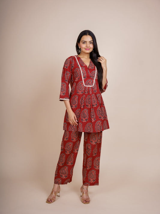 Ekisha's women maroon designer ajrak printed cotton co-ord set lounge wear