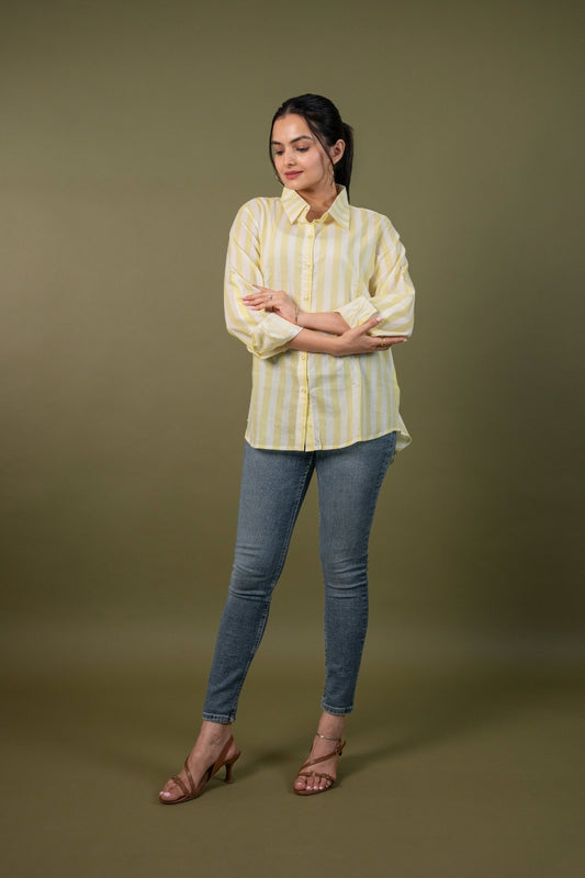 Ekisha Women cotton white yellow stripes relaxed fit shirt