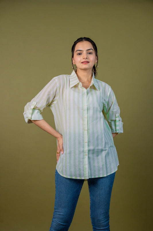 Ekisha Women cotton white green stripes relaxed fit shirt