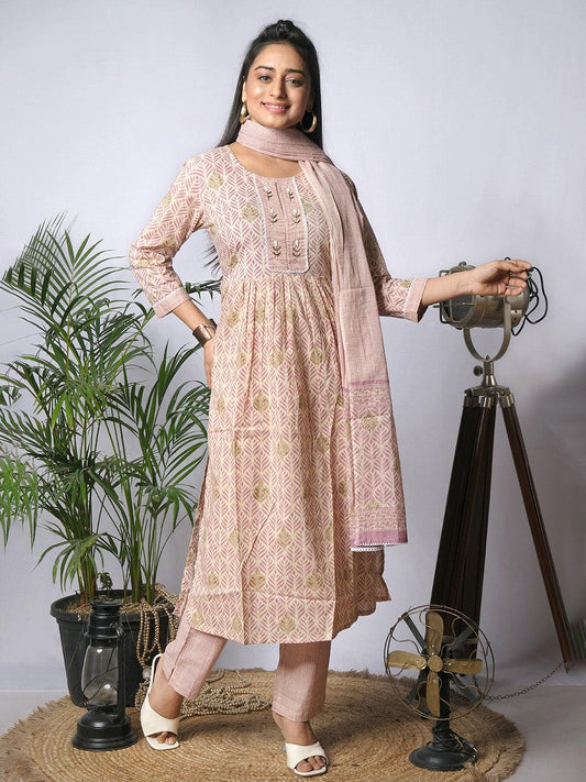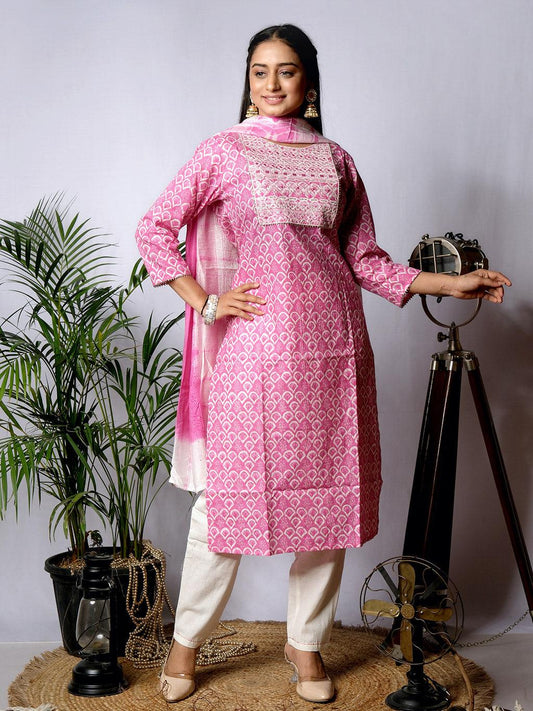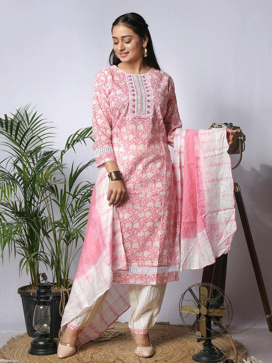 Ekisha's women printed pink embroidered cotton kurta and pant set with dupatta