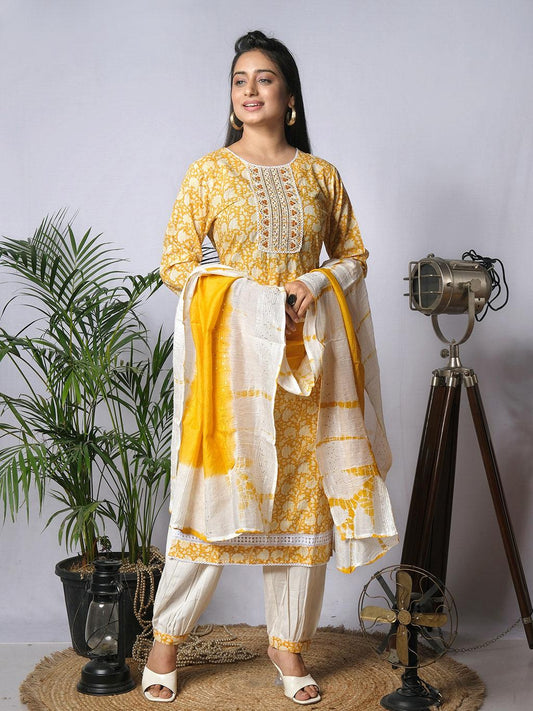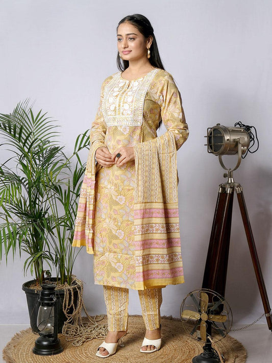 Ekisha's women printed yellow embroidered cotton kurta and pant set with dupatta
