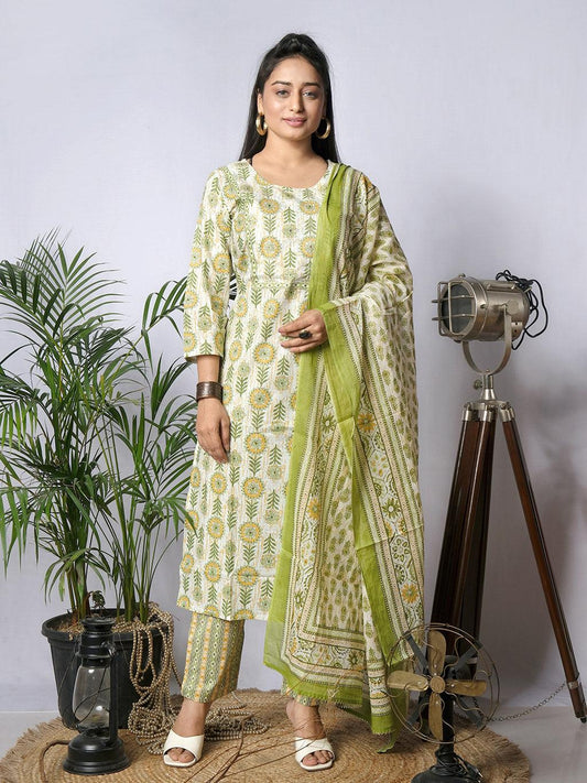 Ekisha's women printed white green floral cotton kurta and pant set with dupatta