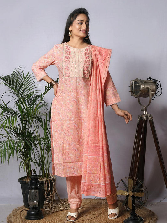 Ekisha's women printed peach embroidered cotton kurta and pant set with dupatta