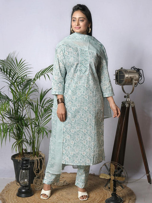 Ekisha's women printed cgreen cotton kurta and pant set with dupatta