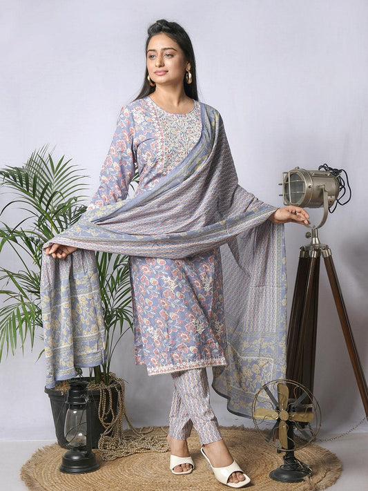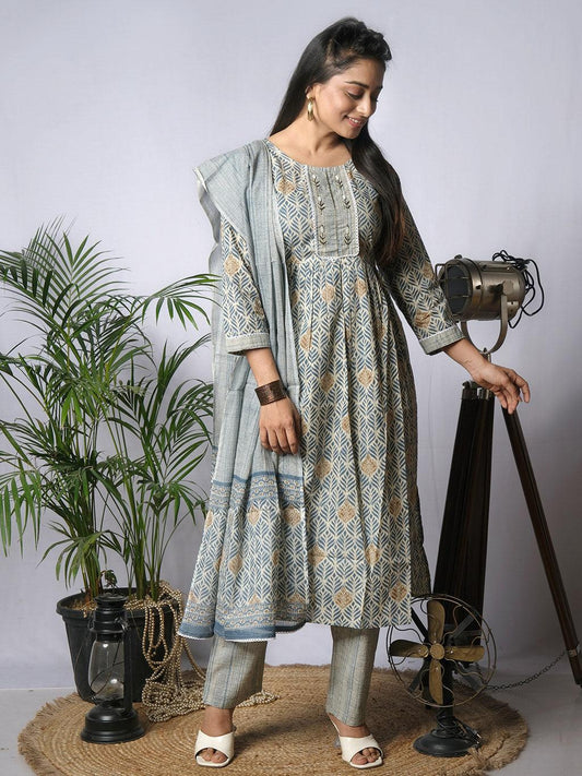 Ekisha's women printed grey blue cotton kurta and pant set with dupatta