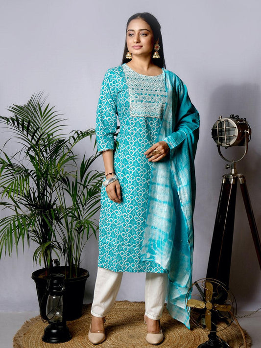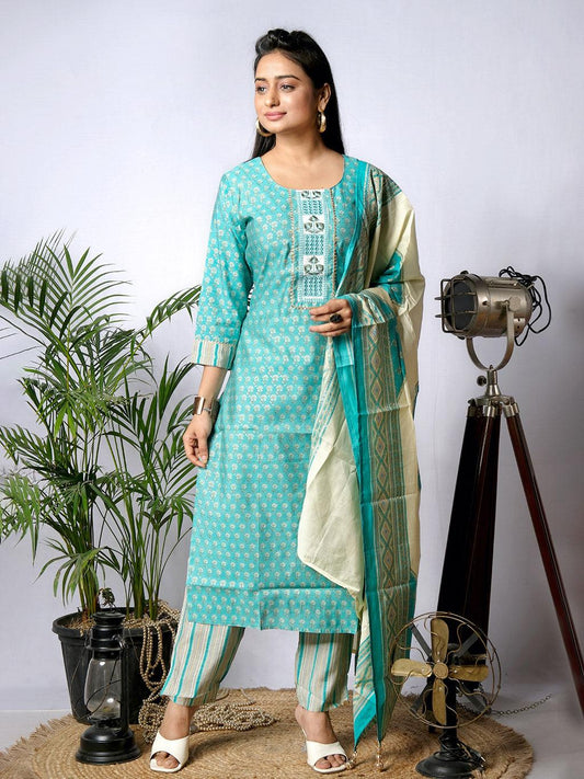 Ekisha's women printed rama embroidered cotton kurta and pant set with dupatta