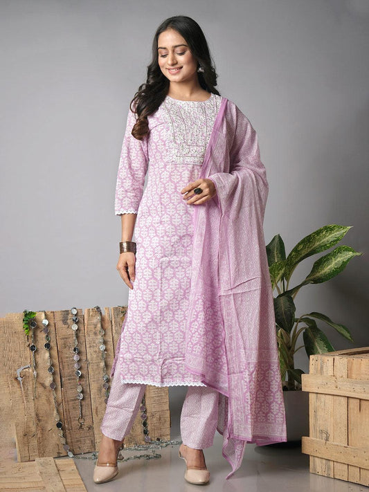 Ekisha's women printed floral light purple cotton kurta and pant set with dupatta