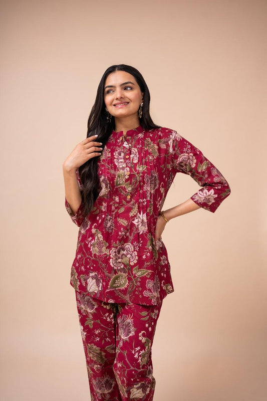 Ekisha's women dark pink multicolor floral printed cotton co-ord set lounge wear