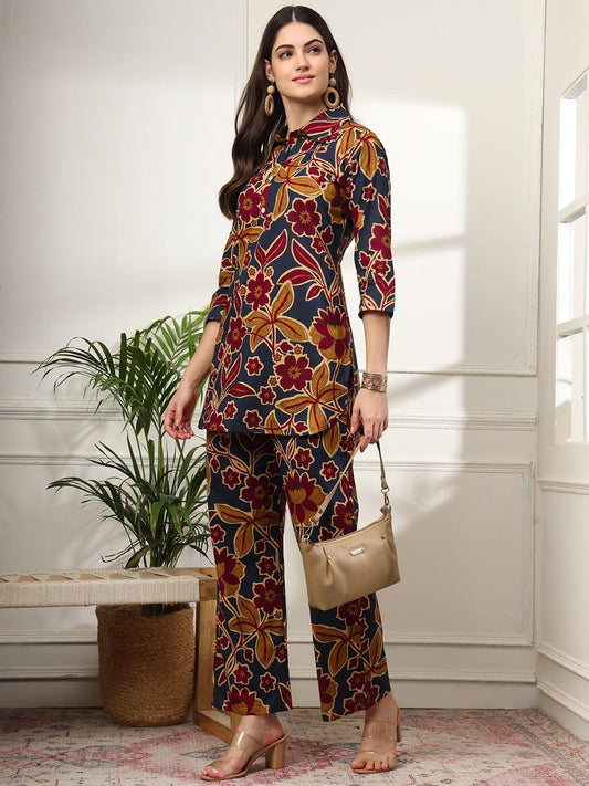 Ekisha's women dark blue multicolor floral printed cotton co-ord set lounge wear