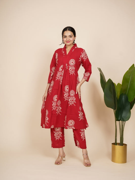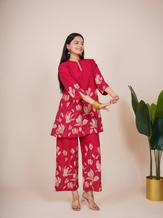 Ekisha's women dark red designer printed floral cotton co-ord set lounge wear