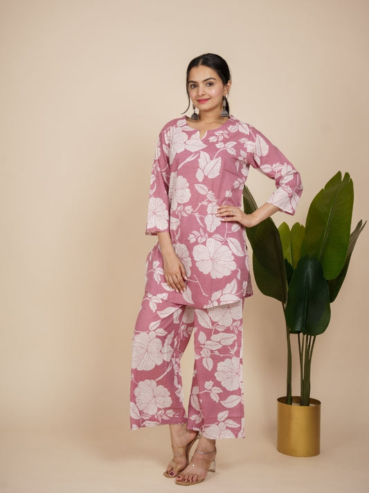 Ekisha's women light pink floral printed cotton co-ord set lounge wear