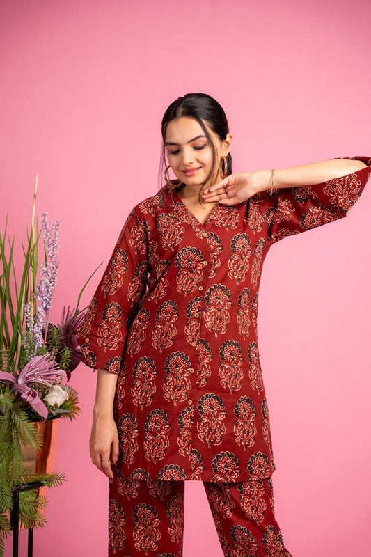 Ekisha's women maroon ajrak multicolor floral printed cotton co-ord set lounge wear