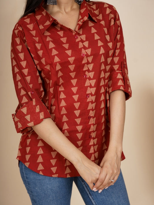 Ekisha Women cotton maroon triangle printed relaxed fit shirt