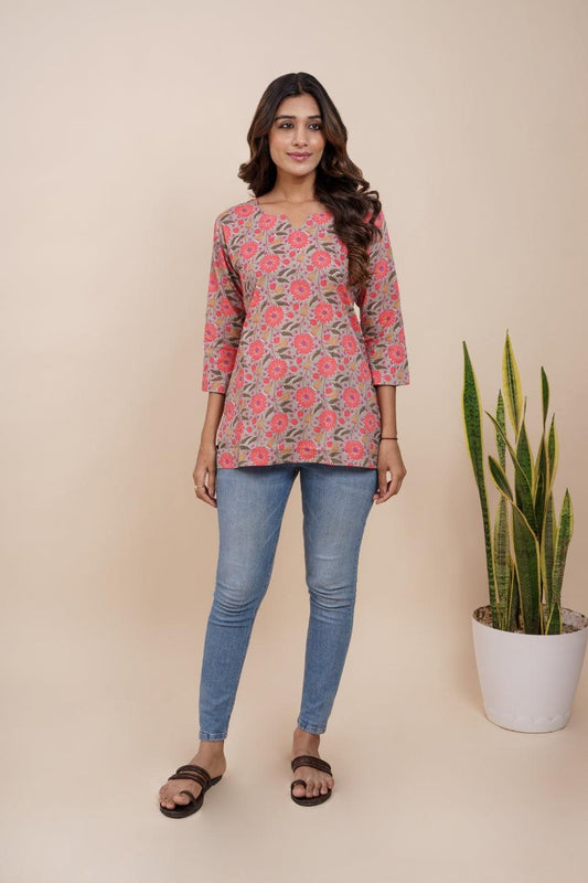 Ekisha's women pink designer floral printed cotton tunic top short kurti
