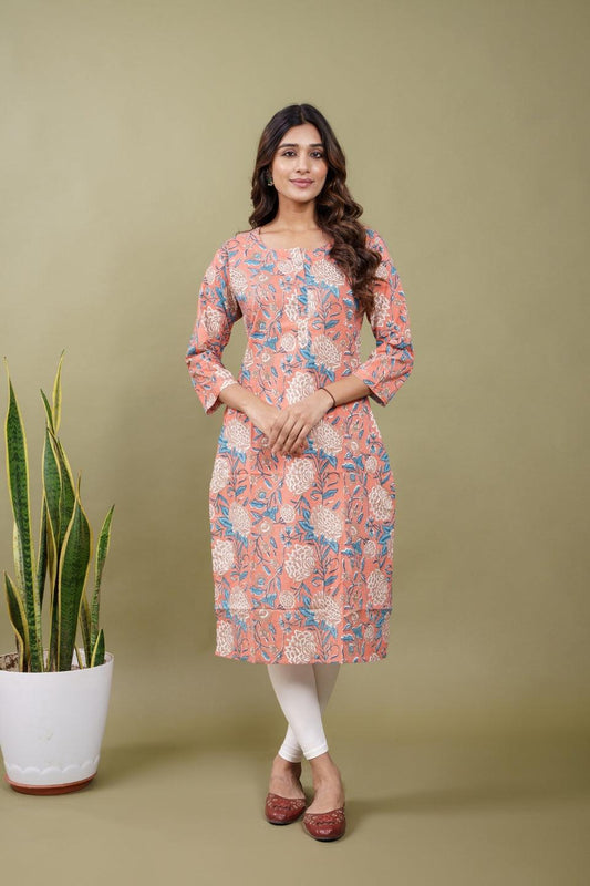 Ekisha women's peach beautiful designer printed multicolor floral printed straight kurta kurti