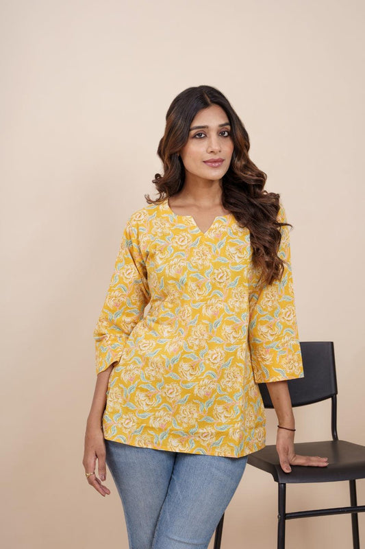 Ekisha's women yellow beautiful designer floral printed cotton tunic top short kurti