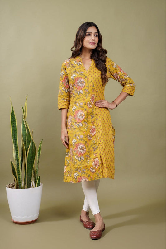 Ekisha women's cotton yellow floral printed angrakha kurta kurti
