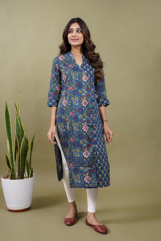 Ekisha women's blue beautiful designer printed multicolor floral printed straight kurta kurti