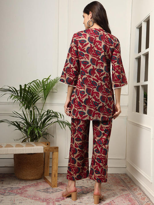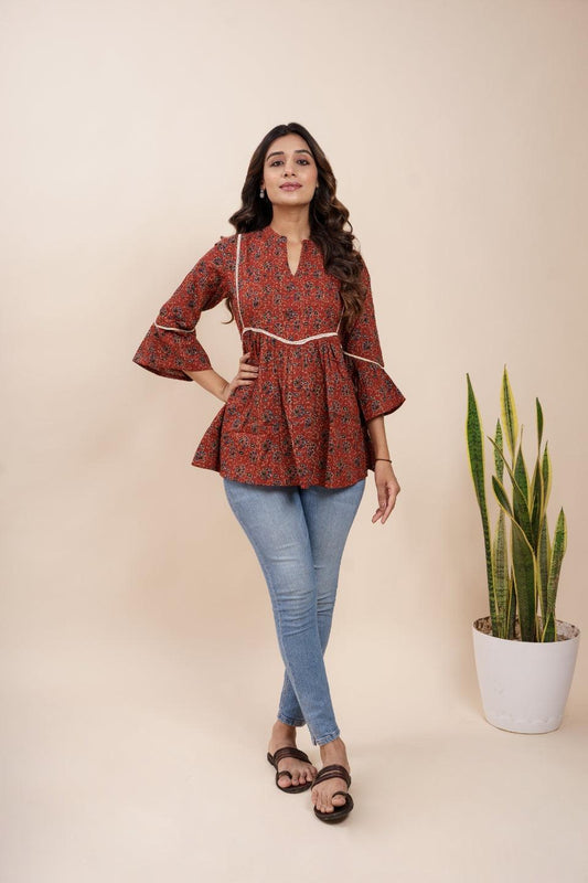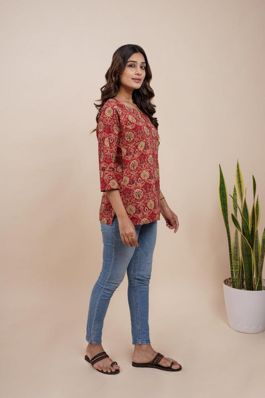 Ekisha's women maroon designer kalamkari floral printed cotton tunic top short kurti