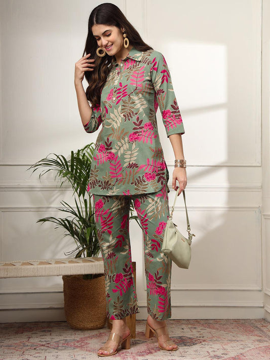Ekisha's women green designer multicolor floral printed cotton co-ord set lounge wear