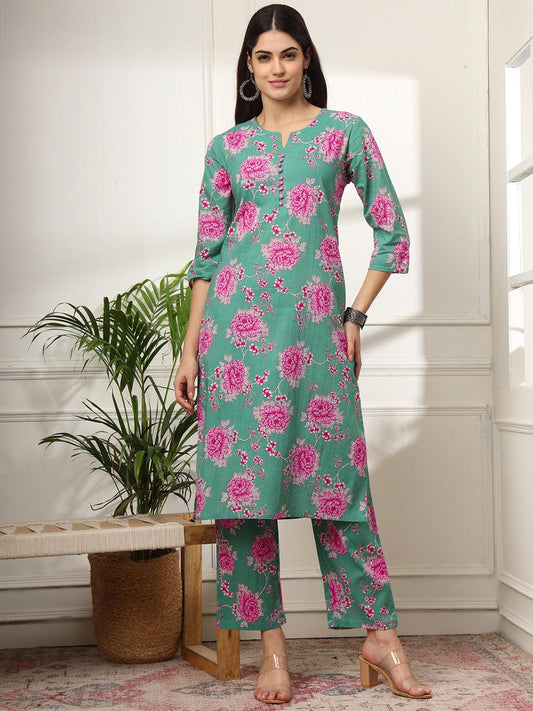 Ekisha's women green multicolor floral printed cotton co-ord set kurta set
