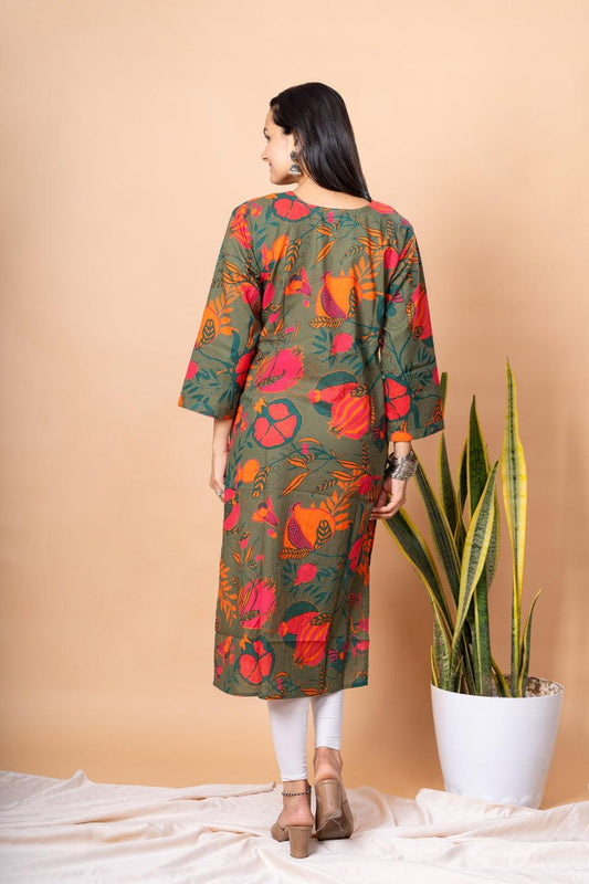 Ekisha women's dark green designer printed multicolor floral printed straight kurta kurti