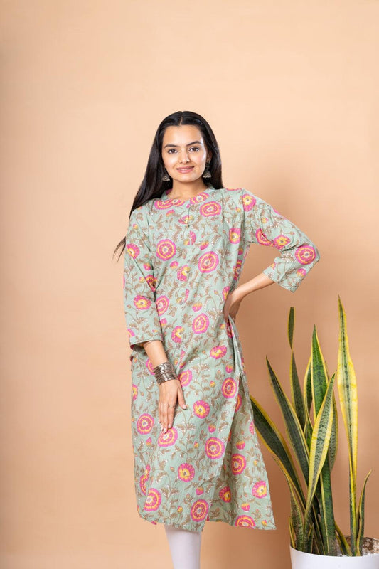 Ekisha women's cotton pink printed straight floral kurta kurti round neck