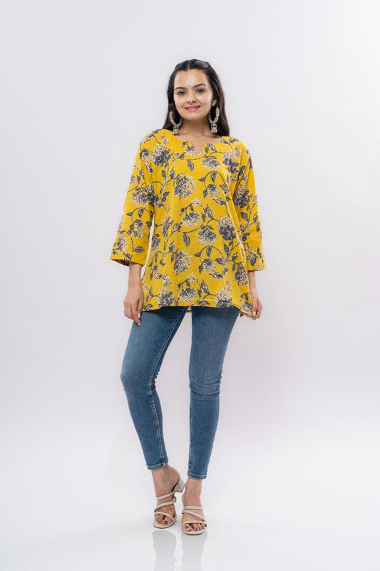 Ekisha's women yellow floral multicolor printed cotton tunic top short kurti